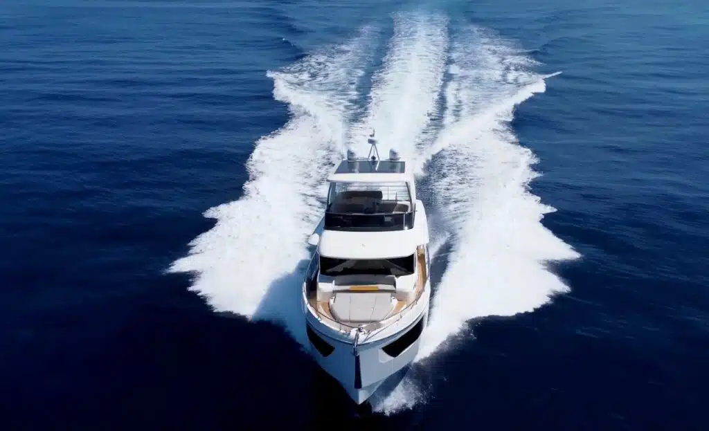 La fondamentale funzione dello scafo di fendere bene le onde e di superarle ha trovato efficacia e stile nel dritto verticale e nello spigolo molto pronunciato del mascone. Le grandi superfici vetrate che vediamo dall’esterno, dall’interno ci fanno ammirare meglio il panorama, anche grazie alla falchetta ribassata, che si apre anche in corrispondenza del pozzetto. È uno yacht con tanta superficie esterna anche perché il flybridge è molto grande. L’hard-top monta pannelli fotovoltaici che generano una potenza di picco di 1350 watt, oppure può avere un soft top centrale apribile. Verso poppa una tenda estendibile.