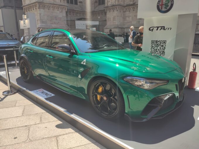 La nuova Alfa Romeo Giulia GTAm, versione estrema e più performante della Giulia Quadrifoglio lanciata insieme alla Giulia GTA, è in bella mostra in Piazza Duomo a Milano, protagonista del Milano Monza Motor Show (MiMo).