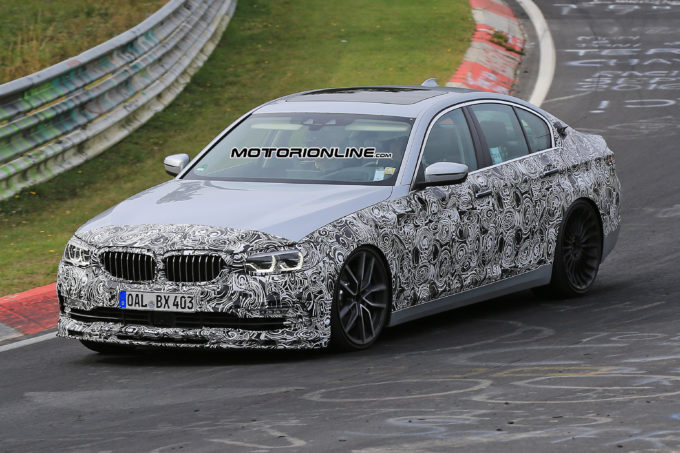 Alpina B5 – La settima generazione della BMW Serie 5 è stata svelata solo da qualche giorno: un indizio non di poco conto se ci riferiamo all’arrivo sul mercato della corrispettiva versione marchiata col logo del costruttore di Buchloe. Difatti non è un caso se, subito dopo la presentazione della nuova BMW Serie 5, siamo riusciti a fotografare su strada, o per meglio dire in pista, la futura Alpina B5 in una livrea quasi spoglia di coperture: ormai la carrozzeria della nuova generazione dell’Alpina B5, che ricalca al 95% quella della nuova BMW Serie 5, è coperta soltanto da adesivi che coprono alcune delle parti più suscettibili di novità.