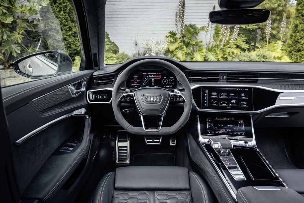 L’interno della RS6 Avant Performance è altrettanto curato, con un abbinamento cromatico che richiama quello esterno, pelle di alta qualità, sedili sportivi e inserti in carbonio. Il cruscotto è digitale e offre diverse modalità di visualizzazione, tra cui una dedicata alle prestazioni, che mostra la pressione del turbo, la temperatura dell’olio, la forza G e la potenza erogata. Il sistema multimediale è dotato di uno schermo touch da 10,1 pollici, che integra il navigatore, il telefono, la radio e le varie funzioni di connettività e assistenza alla guida. Il volante è in pelle e ha i paddle per il cambio al volante, che è una trasmissione Tiptronic ottimizzata per questa versione.