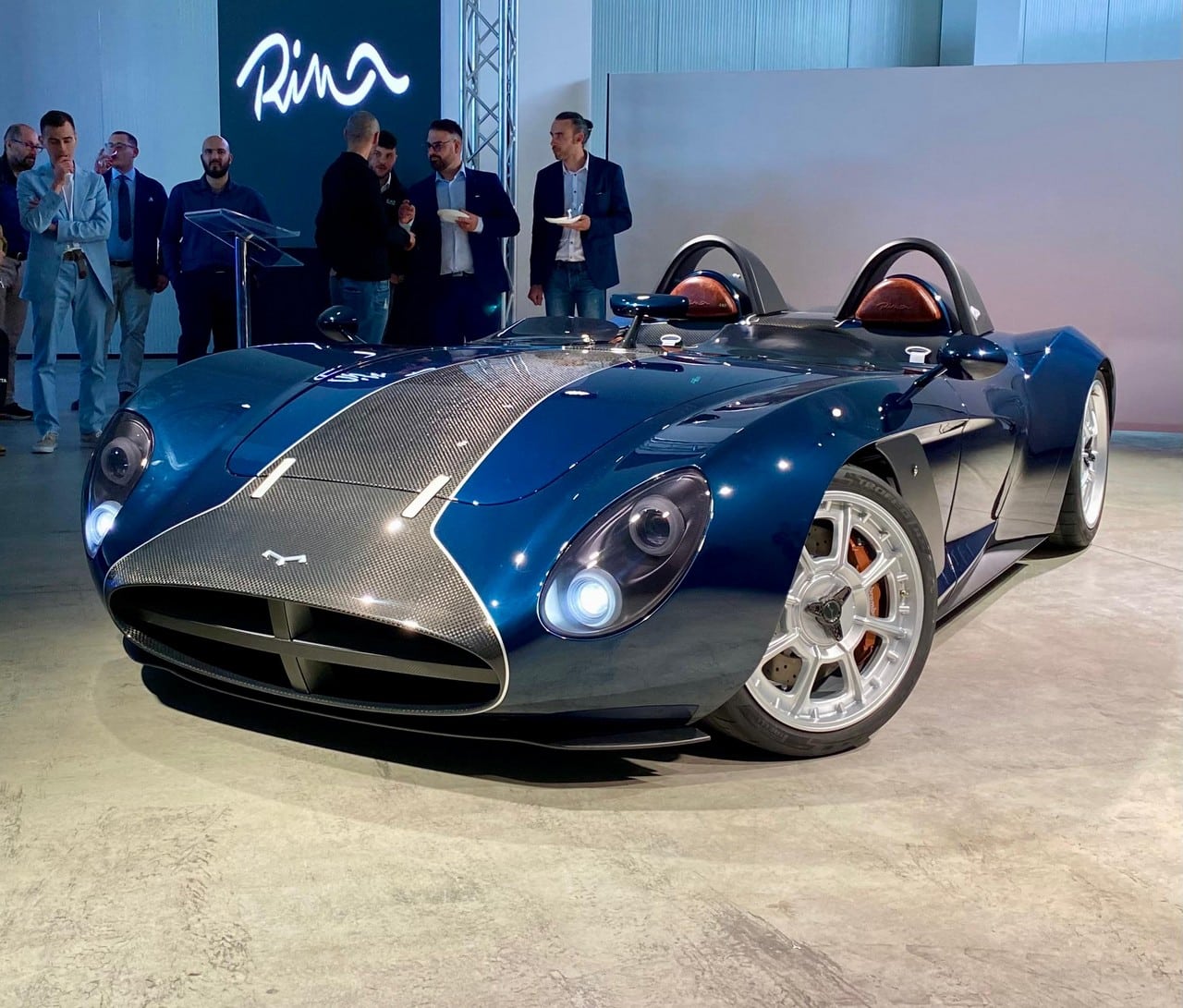 Rina è spinta da un v8 di 5 litri di cilindrata di derivazione Ford Mustang, ma rielaborato nello scarico, nell’aspirazione e nella fasatura degli alberi a camme. I dati di potenza e coppia verranno resi noti solo al termine delle fasi di omologazione, ma possiamo dirvi che ha un suono davvero cattivo e sportivo, distante dal borbottio sommesso dei v8 americani. Molto belli i 4 terminali di scarico, che richiamano anche qui i modelli in uso nelle auto più sportive degli anni sessanta. La trasmissione è posta sull’asse posteriore, in modo da rendere il bilanciamento dell’auto 50%-50% tra asse anteriore e posteriore. La scocca è, come dicevamo, in carbonio con due telai ausiliari. A questi sono collegate le sospensioni a quadrilatero con gruppo molla-ammortizzatore regolabile. I cerchi, forgiati e scomponibili, sono realizzati su specifico disegno e richiamano le ruote Campagnolo presenti sulle super car dell’epoca. Le dimensioni sono però assolutamente moderne, con pneumatici 245/35 su cerchi da 19″ all’anteriore e 305/30 su cerchi da 20″ al posteriore. Dietro a queste ruote trova posto l’impianto frenante Brembo con pinze a 6 pistoncini all’anteriore e a 4 pistoncini al posteriore.