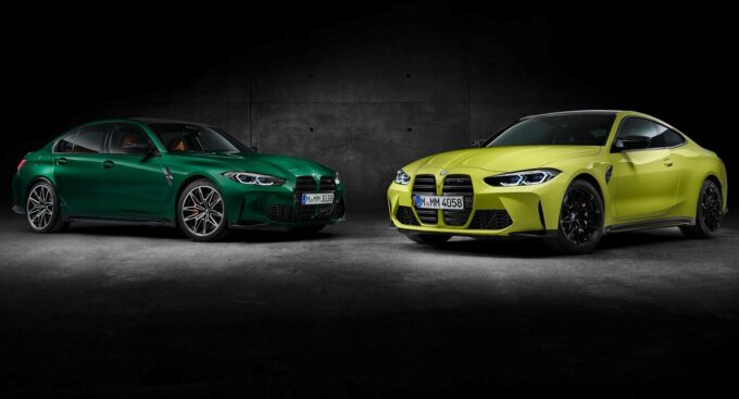 Le BMW M3 e M4 2021 mostrano la nuova e tanto dibattuta griglia a doppio rene allargato con lamelle orizzontali che ha fatto il suo debutto sulla nuova generazione della BMW Serie 4. Entrambe hanno un cofano anteriore stilisticamente aggressivo con nervature ben marcate, con prese d’aria che caratterizzano la parte inferiore del frontale e affilati gruppi ottici. Altrettanto grintoso e cattivo è il disegno del posteriore con un paraurti muscoloso, audace diffusore in bella evidenza e quattro ampi terminali di scarico tondi. I fanali differiscono tra M3 e M4, con una linea più tagliente sulla coupé due porte rispetto a quella più regolare sulla M3.