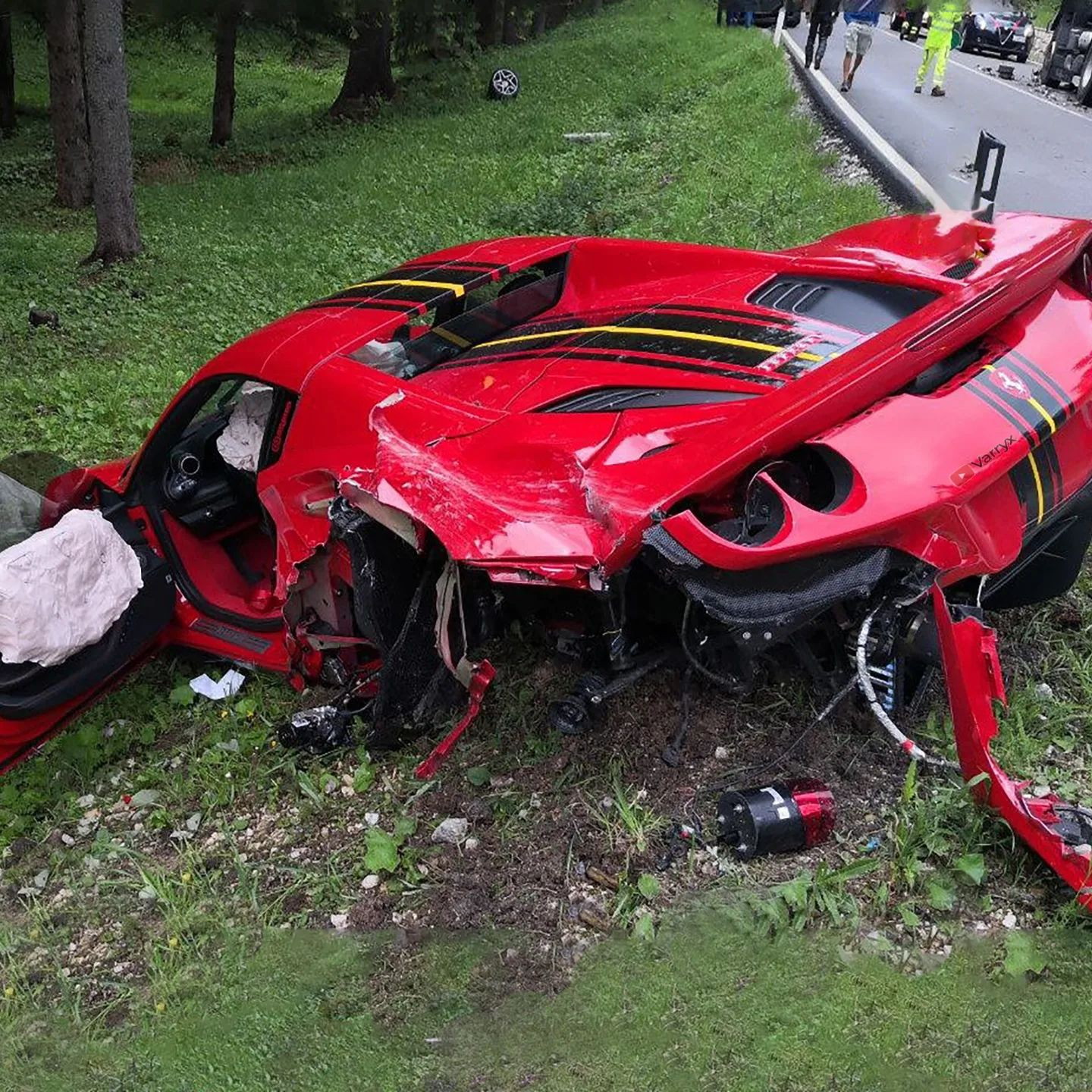 Nessuna immagine dell’avantreno della Ferrari è stata condivisa online, quindi è impossibile sapere quanti danni abbia subito. Quello che possiamo vedere è che il lato passeggero sembra essere sfuggito a gravi danni.