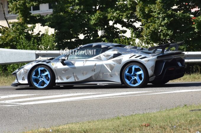 La Ferrari SF90 XX Stradale, che solo qualche settimana fa si è appuntata sul petto la medaglia di “auto stradale più veloce” sulla pista di Fiorano, torna sotto le luci dei riflettori con un prototipo parzialmente camuffato, caratterizzato dalla carrozzeria in tinta Grigio Alloy e dai cerchi color azzurro, che è stata avvistato in strada come mostrano le foto spia di Gabetz Spy Unit, condivise sui social da Walter Vayr.