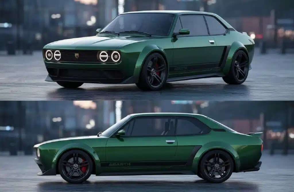 Il concept trasforma la mitica Fiat 128 Coupé in una compatta Abarth moderna, con linee larghe e muscolose che ampliano la presenza su strada senza tradire le proporzioni originali degli anni ’70. Il verde scuro abbinato a dettagli neri conferisce al veicolo un aspetto deciso, quasi da muscle car compatta, mentre il design aggressivo e contemporaneo valorizza l’eredità italiana del modello. Questa reinterpretazione digitale rende omaggio alla tradizione, proiettando la Fiat 128 in un contesto futuristico e accattivante.