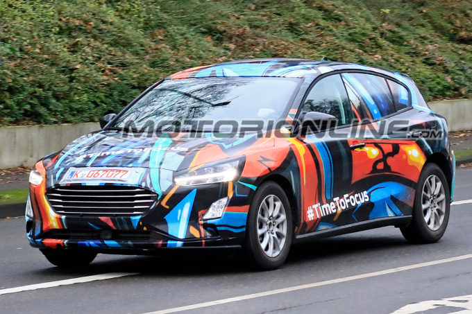 In effetti il nuovo modello di Focus si mostra senza veli e coperto soltanto da una “tinta mimetica” dovuta ad una livrea molto vivace che grazie ad un mix di tratti colorati riesce a “nascondere” le forme definitive della nuova nata. A sostenere l’ipotesi dell’operazione di marketing sembrano esserci anche le diverse scritte adesive che campeggiano su varie parti della carrozzeria che rimandano all’hashtag #TimeToFocus.