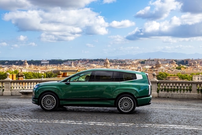 Grande e grossa, in città la Ioniq 9 mette quasi soggezione, anche se la visuale aiuta percepire gli ingombri anche nel traffico. Quando si arriva in autostrada da il meglio di sé con un assetto morbido che stempera le asperità e genera quell’effetto tappeto volante che, unito al silenzio assoluto dell’abitacolo, ed alla comodità delle sedute, consente di arrivare riposati anche al termine di un lungo viaggio. Con 428 CV, la trazione integrale, ed uno sterzo più comunicativo di quanto si potrebbe pensare, tarato con la giusta consistenza, la AWD Performance che abbiamo guidato sa farsi valere, anche nel misto, fermo restando che vanno tenuti in considerazione i trasferimenti di carico ed una massa importante. Per il consumo ci riserviamo di effettuare una prova più approfondita, ma nel percorso che da Roma ci ha condotto ai Castelli Romani per poi ritornare nella città eterna, la vettura non ha mai dato l’impressione di soffrire problemi di autonomia. Puntuali, anche fin troppo gli interventi degli aiuti alla guida, soprattutto il dispositivo che frena la vettura in retromarcia quando sopraggiungono altri veicoli. Pratici gli schermi per le telecamere posizionate al posto dei retrovisori esterni, perché la loro posizione, anche se non aiuta il design interno, consente di comprendere bene cosa succede intorno all’auto, ovviamente bisogna farci l’abitudine, ma aiutano nelle condizioni di bassa visibilità.