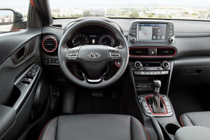 I rivestimenti in nero degli interni sono abbinabili con tre varianti cromatiche che personalizzano la Kona con le parti in contrasto colorate in arancione, rosso o verde lime. L’infotainment di bordo è affidata al display touch da 8 pollici che integra la compatibilità con i sistemi Android Auto e Apple CarPlay, mentre sotto è posto il vano per ricaricare in wireless il proprio smartphone.