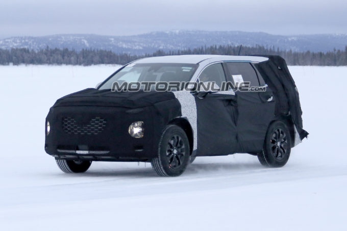 Hyundai Santa Fe – Il Suv top di gamma del costruttore coreano nel prossimo futuro avrà dimensioni ancora più voluminose rispetto a quelle già ampie della versione attuale: a svelarlo sia il CEO di Hyundai America, Dave Zuchowski, che le prime immagini del muletto del futuro modello di Hyundai Santa Fe fotografato dai nostri fotografi nel corso di alcuni test drive sulle innevate strade svedesi.