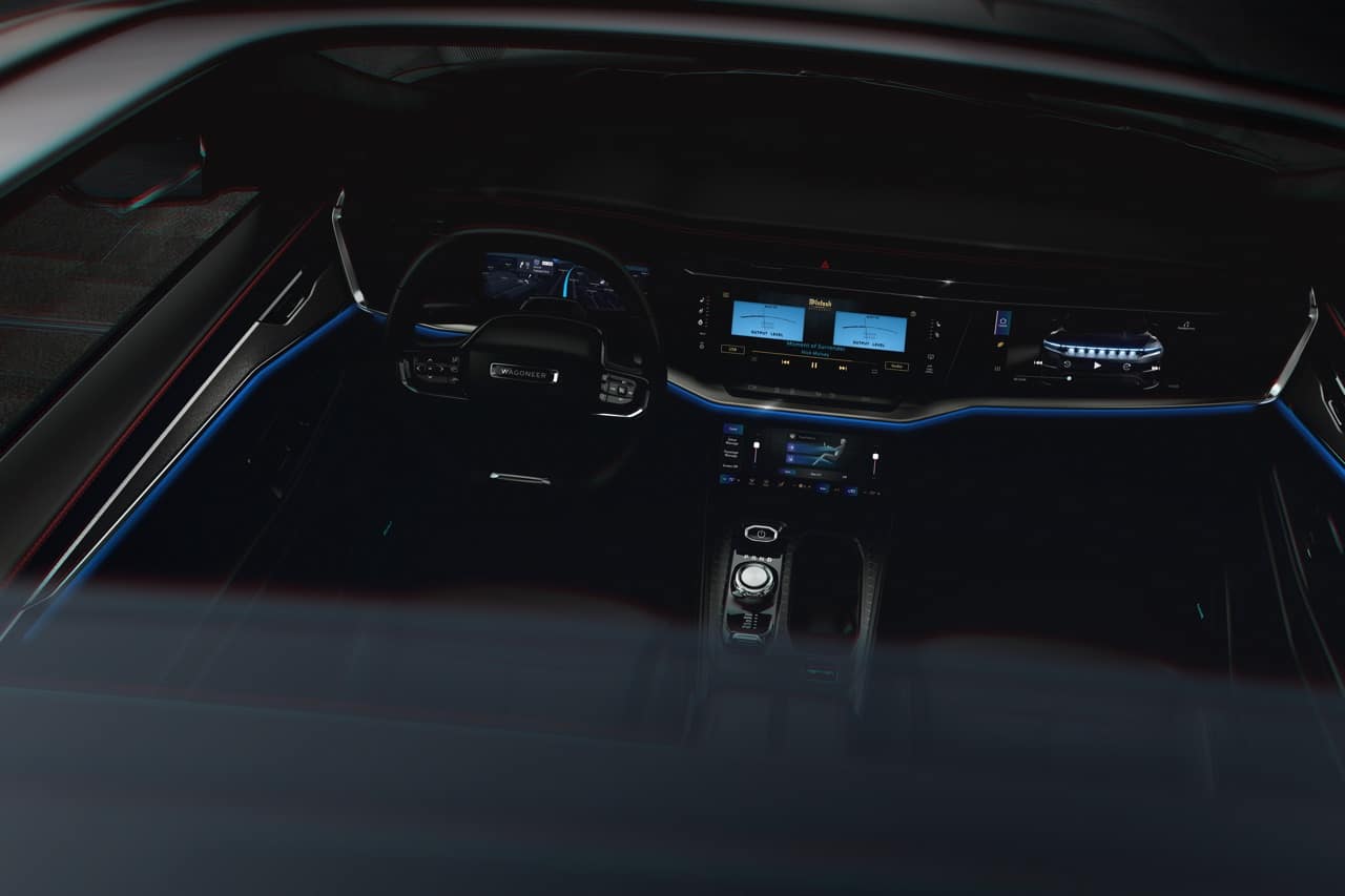 Per il resto, si notano i tasti a sfioramento per regolare il climatizzatore ed il doppio selettore sul tunnel centrale, quello per la marcia e quello per la modalità di guida, denominato Selec-Terrain, con cinque opzioni disponibili (Sand, Snow, Eco, Auto e Sport). Inoltre, la nuova Wagoneer S sarà dotata di illuminazione ambientale dinamica e personalizzabile, di un tetto panoramico a doppio pannello di serie e del sistema audio McIntosh con 19 altoparlanti, per un sound di alta qualità.