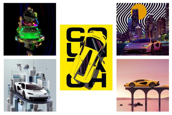 Shy.Studio, studio indipendente di motion graphic specializzato in animazioni 3D e immagini still life, si ispira all’influenza dei poster vintage della Countach degli anni ’80 riproducendola in una ambientazione moderna; il leggendario design della Countach si mescola con elementi astratti, tattili e oggetti che sembrano provenire da un altro mondo.