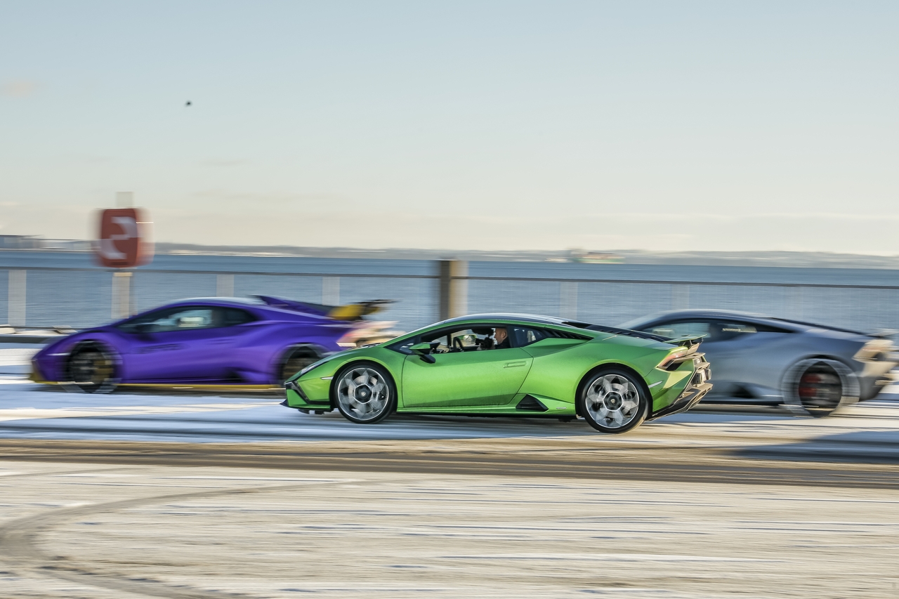 Le vetture a due e quattro ruote motrici hanno affrontato con disinvoltura le superfici ghiacciate e la neve, attirando l’attenzione al loro passaggio per i colori sgargianti e il design tipico di Lamborghini.