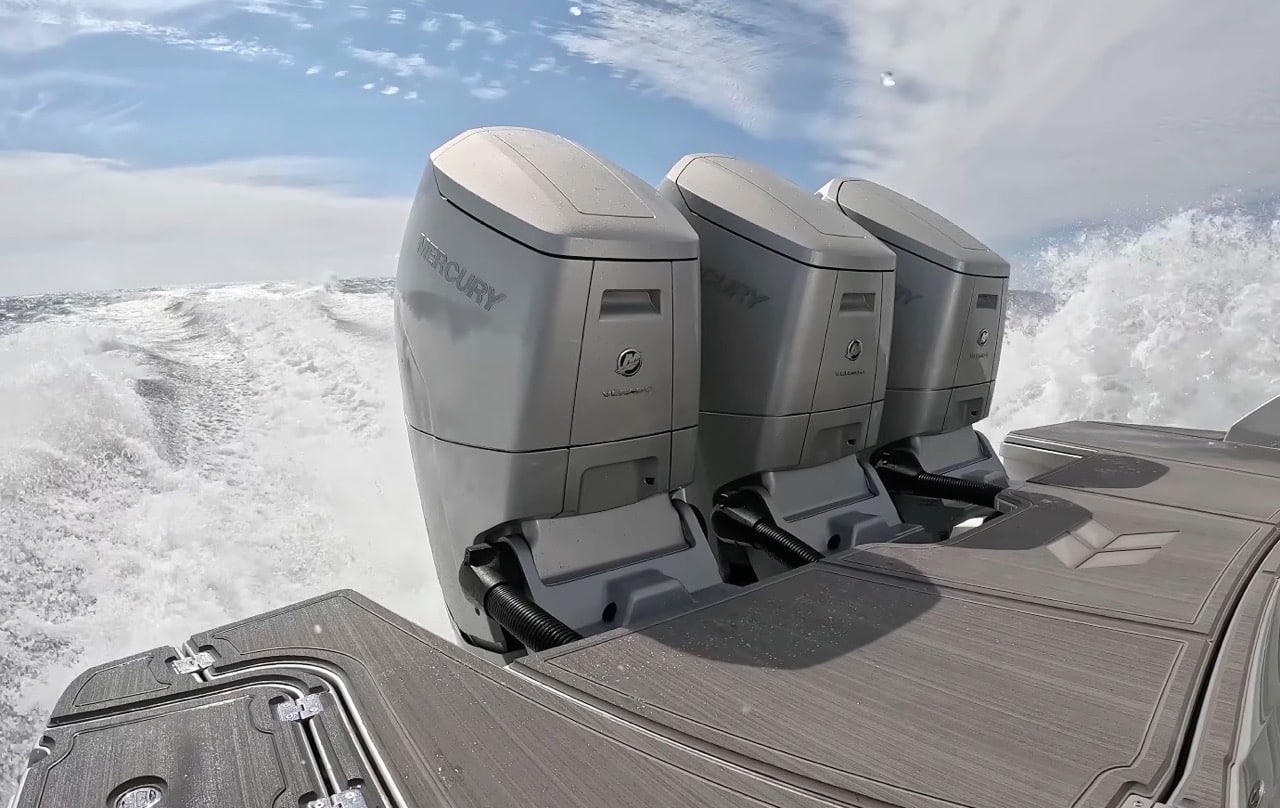 Tredici metri e mezzo di lunghezza e la possibilità di montare una potenza massima di 2.000 cavalli. Incredibile, vero? Però, se vi basta una velocità massima intorno ai 40 nodi, sono sufficienti, secondo il cantiere, tre motori da 400 cavalli. Oggi abbiamo un po’ di potenza in più: tre motori da 600 cavalli. Sono i V12 Verado di Mercury. Totale 1.800 cavalli. Basta appoggiare la mano sulla manetta e siamo a 15 nodi. Non c’è differenza di assetto tra il dislocamento e la frenata, perché il gommone, lo scafo, sale perfettamente da prua a poppa parallelo alla superficie. Questo significa che possiamo scegliere qualsiasi andatura, sicuri di avere un rendimento ottimale. Questi motori li conosciamo bene: 12 cilindri a V, 7.600 centimetri cubi e soprattutto il corpo motore, il blocco e il gambale attaccati allo specchio di poppa in maniera rigida, solidale. C’è solo il piede sterzante, questo significa che possiamo avere meno vibrazioni e che la struttura nel complesso comunque è più robusta. Sono installati su un bracket, che ha anche una funzione idrodinamica importante. Allungare lo scafo poi alla fine serve anche per navigare meglio, oltre che per avere prestazioni migliori.