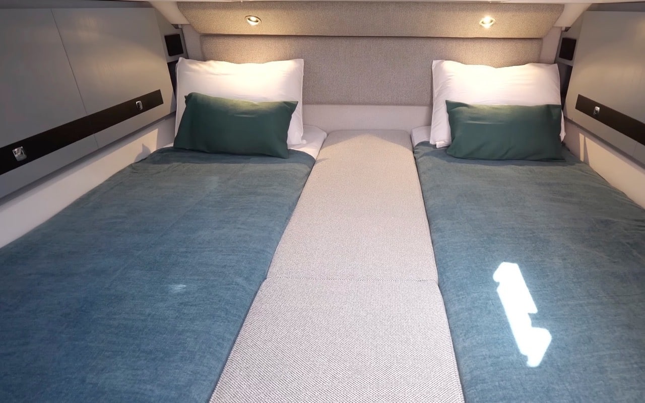 Il rivestimento del pagliolato è di Marine Mat, marchio premium americano, eccellente per il grip antiscivolo, la facilità di manutenzione e pulizia. Le elaborazioni che vedete sono opera dell’importatore italiano Italdeck. Qui hanno optato per una colorazione simile alla verniciatura dello scafo, ma potete sbizzarrirvi scegliendo tra una quarantina di colori e sette diversi spessori per ottenere sotto i piedi la morbidezza, l’elasticità, il comfort che volete. Il mobile cucina, piuttosto grande, contiene tra l’altro due frigoriferi da 100 litri. Di questa postazione di pilotaggio mi piace tutto, ma in particolare queste poltroncine, perché posso sedermi, puntellare i piedi e sono protetto da queste spallette verticali. Così quando lo scafo va in sbandata mi sento più tranquillo, anche se al comando c’è un pilota un po’ matto. Qui a prua la falchetta per quanto basta evita le scivolate fuori bordo. I corrimano sui fianchi della tuga ci aiutano a scendere nel pozzetto, dove corridoi ampissimi ci permettono di muoverci in libertà. Ma quanto è bello il profilo frontale di questo hard-top. Qui sotto c’è lo spazio per gli archi di un tendalino che si ribalta sull’appoggiatesta per creare qui una zona d’ombra.