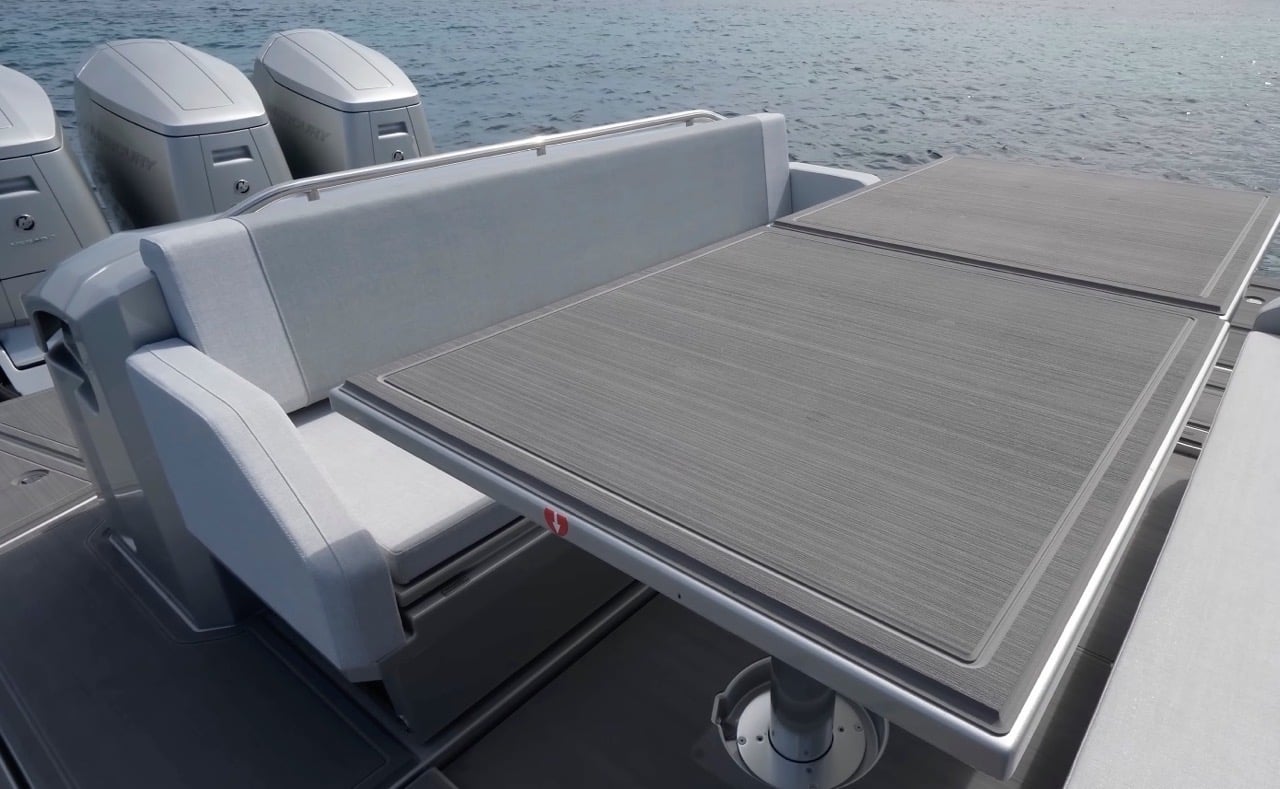 Scafo e coperta sono verniciati con tinte metallizzate a scelta. Quella poppiera è l’area più importante per la vivibilità, per il contatto con il mare. Per riservarne la bellezza estetica hanno raccolto in una zona dedicata e nascosta l’imbarco carburante, la presa elettrica di banchina e la doccia. Sotto questo portello la predisposizione per il verricello elettrico e l’ancora di poppa per un ormeggio in rada più sicuro. Qui sotto tanto spazio per le attrezzature da bagno e per lo snorkeling. Per scendere a terra c’è una passerella molto lunga, completa di tienti bene. Regolando l’altezza dei tavoli elettroidraulici otteniamo il prendisole. Le imbottiture sono realizzate con materiale a cellula chiusa e drycell per non trattenere l’acqua. Il riparo dell’hard-top può essere esteso verso poppa con un tendalino teso tra quattro pali di carbonio.