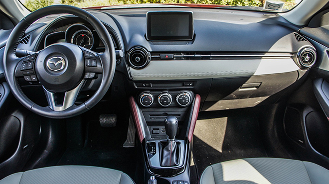 Salendo a bordo si scopre un abitacolo che riprende in gran parte quello della Mazda 2 con cui condivide la piattaforma. Anche qui resta curiosa la forma della plancia, dove le bocchette asimmetriche si fanno notare: due tonde per chi guida, tonda quella di destra e a sviluppo orizzontale quella di sinistra per il passeggero, per un risultato estetico piacevolmente originale. I comandi, come ormai vediamo sempre più spesso, spariscono dalla zona della radio davanti al cambio e sono solo al volante o sul tunnel centrale (o tramite il touchscreen stesso). Lo schermo segue la moda del momento e sembra aggiunto alla linea della plancia, come elemento esterno e non integrato. Bello il volante sportivo a 3 razze che include nel nostro caso anche i paddle, i comandi per il Cruise adattivo e quelli della radio. Particolare, ed a noi è piaciuta, la soluzione con le razze centrali carbon look (medesima finitura che ritroviamo in alcuni inserti come sulle portiere) e quella in basso color alluminio. Nel complesso sono due le caratteristiche dell’abitacolo che maggiormente colpiscono: una elegante sportività, con tanti elementi molto originali, oltre alla qualità percepita, allineata con quella della migliore concorrenza premium. Come abbiamo già accennato, tanti pregi ed un solo difetto importante, quello di una abitabilità e di spazi più contenuti del previsto nella zona posteriore. Se di per sé i 350 i litri a disposizione per il bagagliaio non sono pochissimi, la disposizione degli spazi non è delle migliori. A questo si aggiunga la presenza del pianale rimuovile, utile a portare il livello alla medesima altezza della soglia e che lascia un comodo spazio nascosto nella parte inferiore (perfetto per riporre anche la cappelliera), ma che, quando si vuole sfruttare tutto lo spazio, va rimosso e non è posizionabile sul fondo del bagagliaio.