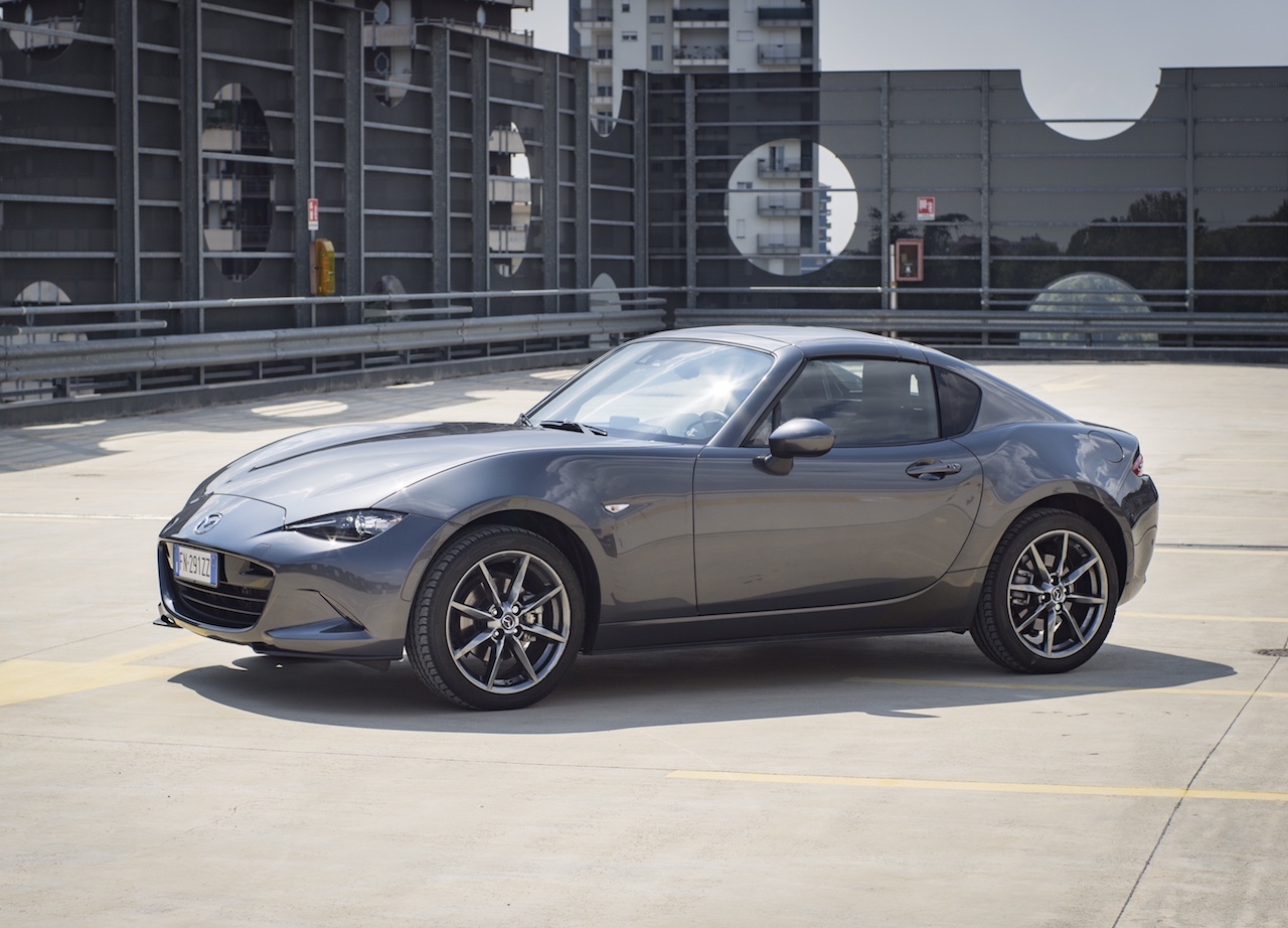 In un momento storico in cui i grossi temi per il mondo dell’auto sono la guida autonoma e l’elettrificazione, la Mx-5 è un po’ come una macchina del tempo, consente di tornare indietro e riassaporare un gusto e delle sensazioni dal sapore assolutamente old style. Un piacere di guida ancora analogico in un mondo che ormai è digitale. Pochi filtri, pochi artifizi elettronici, e la sola concessione alla modernità data dai dispositivi di sicurezza e dal tasto sport, la cui influenza resta comunque marginale. Per il resto la RF è una vettura capace di fare sentire la strada, di divertire sempre e comunque, senza doversi necessariamente impegnare raggiungendo velocità da ritiro patente. In curva, nella fase di percorrenza, comunica tutto, ed anche senza forzare esageratamente l’andatura, ci si gode una bellissima danza tra sotto e sovrasterzo, che rende la guida di un divertimento senza eguali. L’assetto è tendente al rigido ma ben lungi dall’essere piatto come una tavola. La RF, dopo un attimo di inerzia in inserimento, trova l’appoggio sulle ruote esterne, con il muso che resta sempre ben saldo. A quel punto, il bello, sta tutto nel giocare con l’acceleratore. Volendo, la Mx-5 la si fa curvare più usando il gas ed i trasferimenti di carico piuttosto che il volante. Volante che, dalla sua, è piuttosto pronto nella sua azione, e consente sempre di capire quello che sta succedendo alle ruote anteriori. Ciò che non ci ha particolarmente stupito, invece, sono i freni. Non esaltanti per mordente e potenza della frenata, e con un pedale che dopo qualche pestone deciso mostra presto qualche segnale di fatica. Nessuna fatica, invece, nell’uso quotidiano della vettura. Pur essendo marcatamente sportiva, infatti, la RF riesce al tempo stesso anche ad essere piacevolmente confortevole. Mai troppo rigida, più silenziosa in autostrada grazie al tetto rigido, finisce per non essere affaticante neanche nei lunghi viaggi.