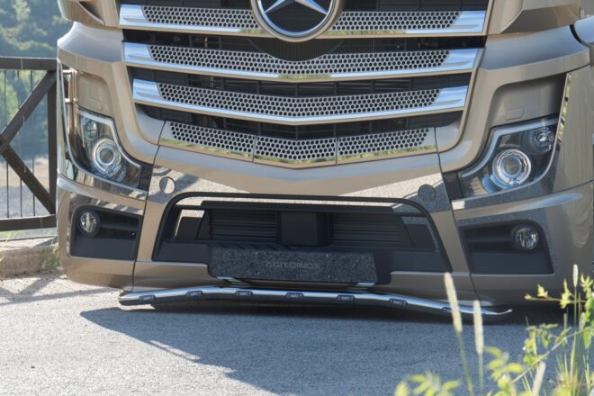 Per la realizzazione di questa nuova icona, Mercedes-Benz Trucks Italia ha scelto AcitoInox come partner, azienda specializzata in progettazione e realizzazione di accessori in acciaio inox per la personalizzazione dei truck. Lo speciale allestimento dell’Actros è caratterizzato nelle parte bassa da un sottile profilo centrale che si allunga verso le estremità del veicolo andando a incrociare i fari, una soluzione stilistica che contribuisce ad incrementare l’imponenza del veicolo, il cui frontale alterna vuoti e pieni.