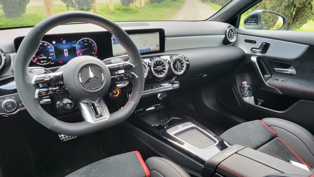 Ho avuto l’opportunità di testare (purtroppo solo per un breve periodo) la AMG A 35, e sono rimasto colpito dalle sue prestazioni. Il motore da 225 kW, con l’aggiunta del supporto dell’unità elettrica di 10 kW, si traduce in una potenza di 306 CV + 14 CV. Grazie al propulsore ora ibrido, la presenza del motorino elettrico consente di avere un maggior spunto nella guida. Inoltre, il motore è in grado di ricaricare brevemente la batteria nei momenti di rilascio e di frenata. Il cambio automatico si dimostra pronto in qualsiasi situazione, sia nella guida sportiva che in quella più normale e maggiormente adatta alla città.