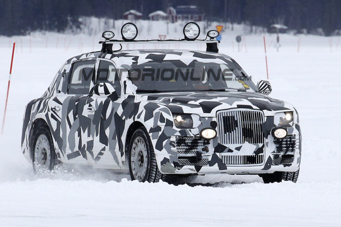 I nostri fotografi hanno immortalato un misterioso prototipo, non meglio identificato, di una berlina di grandi dimensioni impegnata in alcune sessioni di test invernali sulle strade ghiacciate della Svezia. Anche se addosso sembra avere molti tratti stilistici che rimandano a vecchi modelli di Rolls-Royce e Bentley, in realtà il muletto di queste foto spia non ha nulla a che fare con le due Case britanniche.