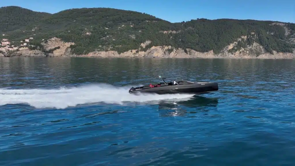 9800 kg, questo è il peso dell’intero scafo a vuoto. La carena in particolare è stata infusa sottovuoto con resina epossidica e fibra di vetro. Nonostante sia leggera, però, la sensazione al timone è quella di una barca solida e a 28,5, ora 29, non mi dà la sensazione di questa velocità, mi sembra di essere fermo. Provo a dare ancora un po’ più di gas. Il disegno di carena presenta, oltre ai normali fascini longitudinali, anche due step e penso che sia questo uno dei segreti di questa morbidezza. Proviamola in virata. Ci entro a 35 nodi, il consumo è sempre di 11 litri per miglio nautico, 382 invece sono i litri che sono consumati per ora. La prua è verticale e siccome non si alza in nessuna delle varie andature che abbiamo fatto, entro in virata molto largo. Non vorrei mai che potesse toccare e quindi impuntare. Stringo la virata man mano e comincio a fidarmi di questa carena. Do sempre un po’ più di gas ai 4 Mercury Verado 500 cavalli Racing. E l’angolo di virata è perfetto. Ma questo è impressionante! Ragazzi, Mi sa che oggi ci divertiamo.