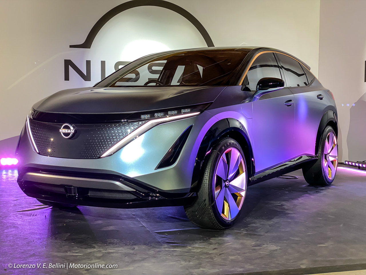 Per quanto riguarda gli interni, dobbiamo ancora affidarci alle foto e ai video ufficiali, in quanto l’abitacolo mostrato a questa anteprima italiana ancora non rappresenta la versione definitiva. Il cruscotto è a sviluppo completamente orizzontale, con una scelta di materiali derivata direttamente dalla tradizione giapponese, come ad esempio l’uso del legno e i pulsanti soft touch per il controllo delle funzioni di bordo. Lo spazio tra l’altro è molto pronunciato, perché i tecnici Nissan hanno spostato l’intero impianto di climatizzazione nella zona frontale, approfittando del fatto che non ci sia più il motore termico. Questo ha consentito un sostanziale guadagno di spazio. I sedili presentano una forma molto moderna e vagamente sportiva, anche se ovviamente il loro principale obiettivo sarà il comfort. Protagonista anche il sistema di infotainment, con l’ormai sempre più alla moda doppio schermo digitale sia per il sistema centrale che per il quadro strumenti. A tutto questo si aggiungono anche diverse “chicche” inedite, come un innovativo head-up display programmato in modo da seguire la posizione della testa del guidatore e adattarsi di conseguenza.