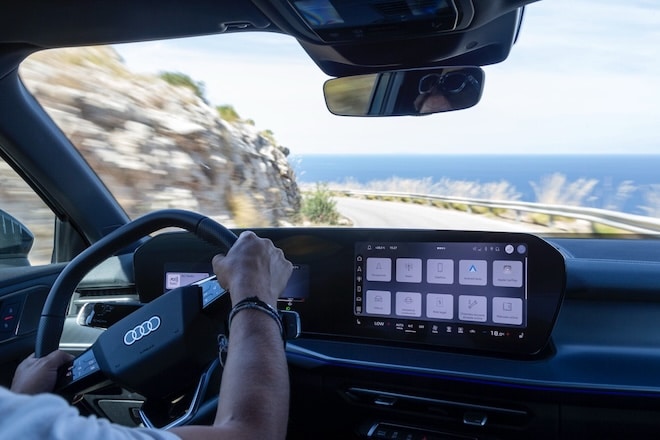 Il viaggio alla scoperta della nuova Audi Q3 prosegue nell’abitacolo, che adesso beneficia di nuovi materiali soft-touch per la parte superiore della plancia e dei pannelli porta, prevede una diversa collocazione del selettore del cambio, alla destra del volante, mentre il satellite sulla sinistra consente di azionare gli indicatori di direzione, i tergicristalli e di gestire i gruppi ottici. Con questa scelta si ottiene più spazio sul tunnel centrale, mentre per ampliare il bagagliaio da 477 litri si può sfruttare lo scorrimento del divano per 13 cm. Il sistema operativo Android automotive OS rende reattivo l’infotainment che si gestisce attraverso uno schermo da 12,3 pollici praticamente attaccato ad un altro display da 11,9 pollici dedicato alla strumentazione digitale. Entrambi portano a battesimo una novità: lo schermo del sistema multimediale adotta per prima volta delle icone più grandi e a sfondo bianco, per essere più chiaro ed intuitivo; mentre il virtual cockpit consente di visionare anche la mappa del navigatore, anche se l’estensione in altezza della stessa potrebbe essere ulteriormente migliorata.