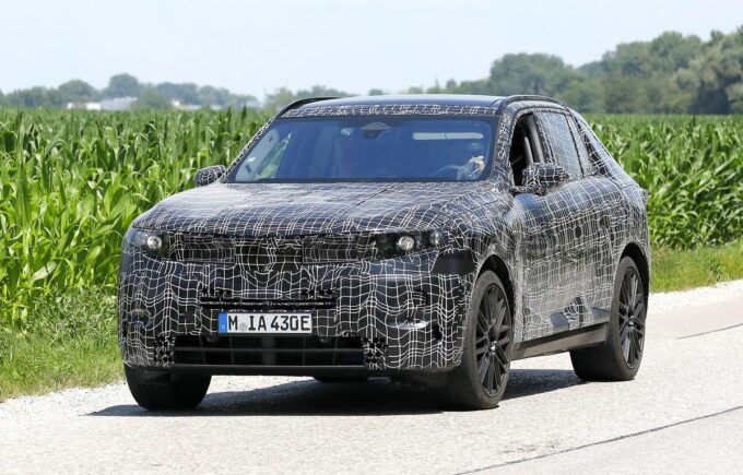 Il prototipo in questi scatti è decisamente più lungo e largo della BMW iX3, con il lunotto posteriore spostato indietro che enfatizza il passo allungato. I fari e la griglia a doppio rene, che possiamo solo supporre siano sotto il camouflage che nasconde il frontale, hanno sicuramente preso ispirazione della Neue Klasse X. Si notano poi le maniglie delle porte posizionate alla base dei montanti, come quelle viste sulle concept Neue Klasse, e lo sportellino di ricarica sul parafango anteriore sinistro, a indicare l’alimentazione ibrida plug-in.