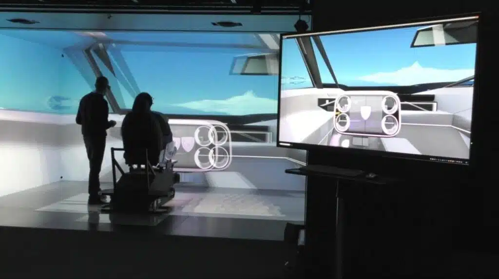 Nel 2015, la casa del Leone ha compiuto un passo avanti significativo nell’ambito della realtà virtuale con l’introduzione di CAVE 2. Questa nuova sala immersiva di realtà virtuale è ancora attiva nel centro di design ADN e beneficia diversi marchi STELLANTIS. Grazie a sei proiettori 4K (4096 x 2160 pixel), le immagini vengono proiettate su cinque schermi a parete che misurano 4,50 metri in larghezza, 2,37 metri in altezza e 3,50 metri in profondità.