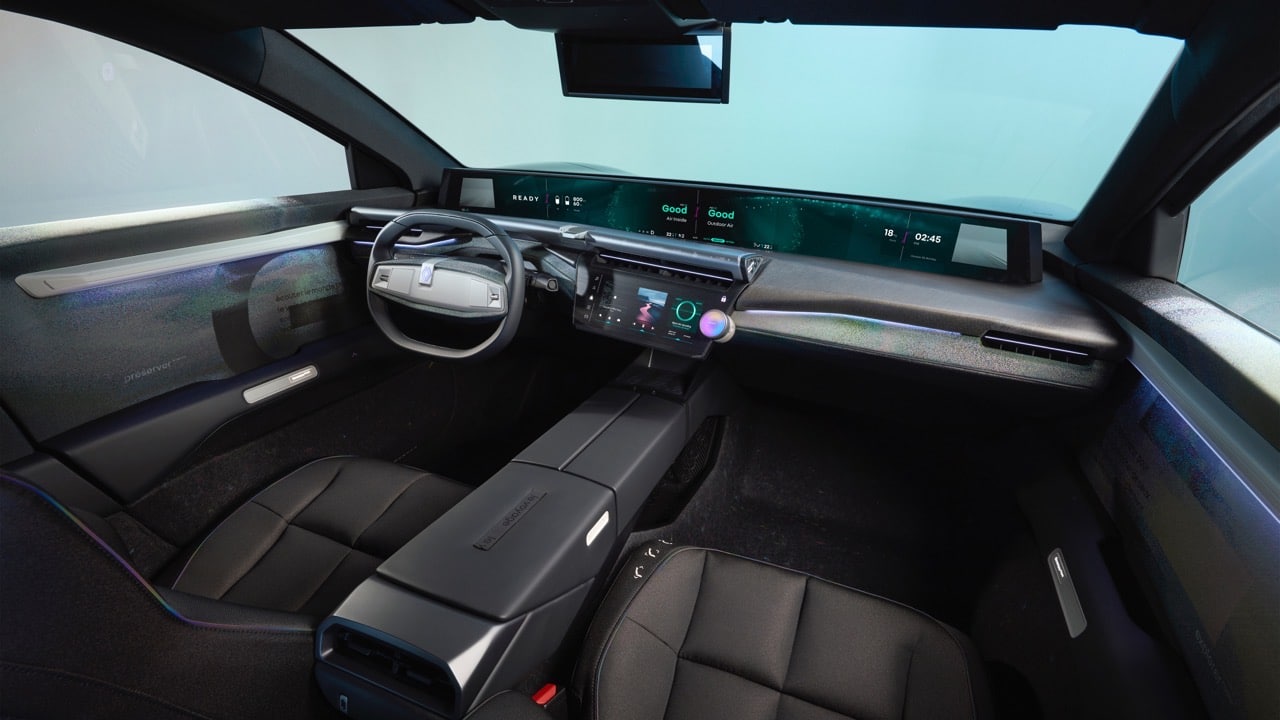 Se delle caratteristiche estetiche, dunque, avevamo già parlato, ora ci concentriamo sugli interni. Dove in primo piano spicca il nuovo grande display OpenR Panorama, che si sviluppa su tutta la lunghezza della plancia. È diviso in tre parti: quella dedicata alle informazioni di guida dietro al volante, la parte centrale per la gestione del climatizzatore e quella a destra per il passeggero.