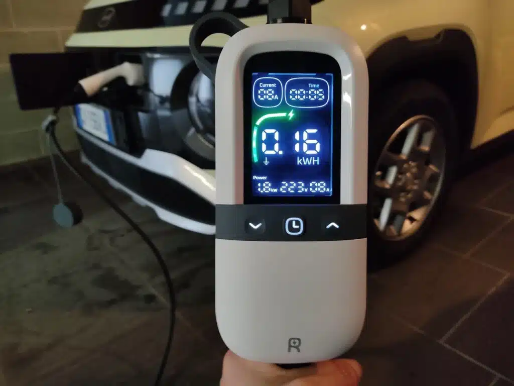 Praticamente si tratta di una ‘colonnina portatile’, con un ampio schermo da 3,5 pollici, dove poter monitorare lo stato di ricarica. Con indicazioni sulla potenza e sul tempo di ricarica, così come sui kWh caricati sulla vettura, oltre ovviamente a capire immediatamente se il processo di ricarica sta avvenendo o se c’è qualche problema. Con un cavo da 1,2 metri con spina Schuko da attaccare alla presa di corrente ed uno da 6 metri con spina Type 2, con tappo protettivo, da inserire nella vettura.