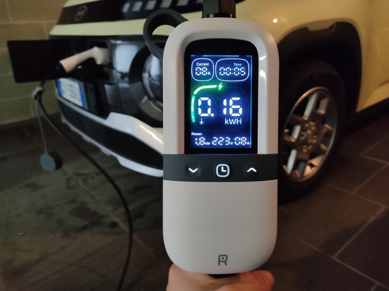 Come dicevamo, non è necessaria alcuna operazione per effettuare la ricarica. L’unica, eventualmente, è quella di ritardare l’avvio della carica, in caso di necessità, ma anche in questo caso è semplice ed immediato, utilizzando i tre tasti sotto il display. La potenza di ricarica dipende da quella disponibile, ma al massimo arriva a 3,6 kW e, di conseguenza, serve un po’ di tempo. Per fare un esempio, abbiamo effettuato la prova con una Hyundai Inster con batteria da 49 kWh e, partendo dal 12%, sono servite quasi 30 ore per una carica completa, con potenza di 1,8 kW.