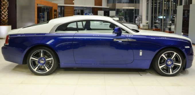 Senza arrivare all’estremo della personalizzazione (anche per quanto riguarda la carrozzeria) come nel caso della Sweptail, molte Rolls Royce si distinguono per l’adozione di una particolare tinta bicolore come nel caso di un esemplare di Wraith presente all’interno dello showroom Rolls-Royce Motor Cars di Abu Dhabi (photo credit: Carscoops.com). L’esemplare in questione è caratterizzato da una tinta esterna Salamanca Blu abbinata ad una vernice English White il cui mix avvolge sia la carrozzeria che i cerchi in lega.