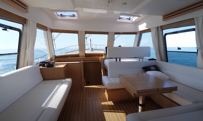 Il cantiere è disponibile a personalizzare gli interni secondo le richieste dell’armatore. Per esempio, il salone vede due possibili layout: sul fianco di dritta sempre un divano a C con tavolo centrale estendibile, sul fianco sinistro un lungo divano oppure la cucina, ma sono possibili anche altre variazioni sul tema.