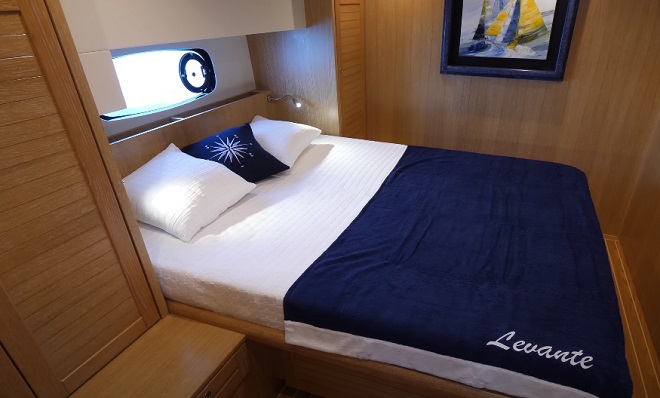 Sotto coperta propongono tre diversi layout, personalmente preferirei quello con la cabina armatoriale a centro scafo, da fianco a fianco, dove adesso troviamo due cabine ospiti. Però devo dire che anche questo esemplare con la cabina armatoriale a prua non è male, perché le dimensioni non risentono dello stringimento dello scafo. Sui fianchi ci sono due armadi a doppia anta, lo spazio è davvero tanto e il bagno molto comodo.