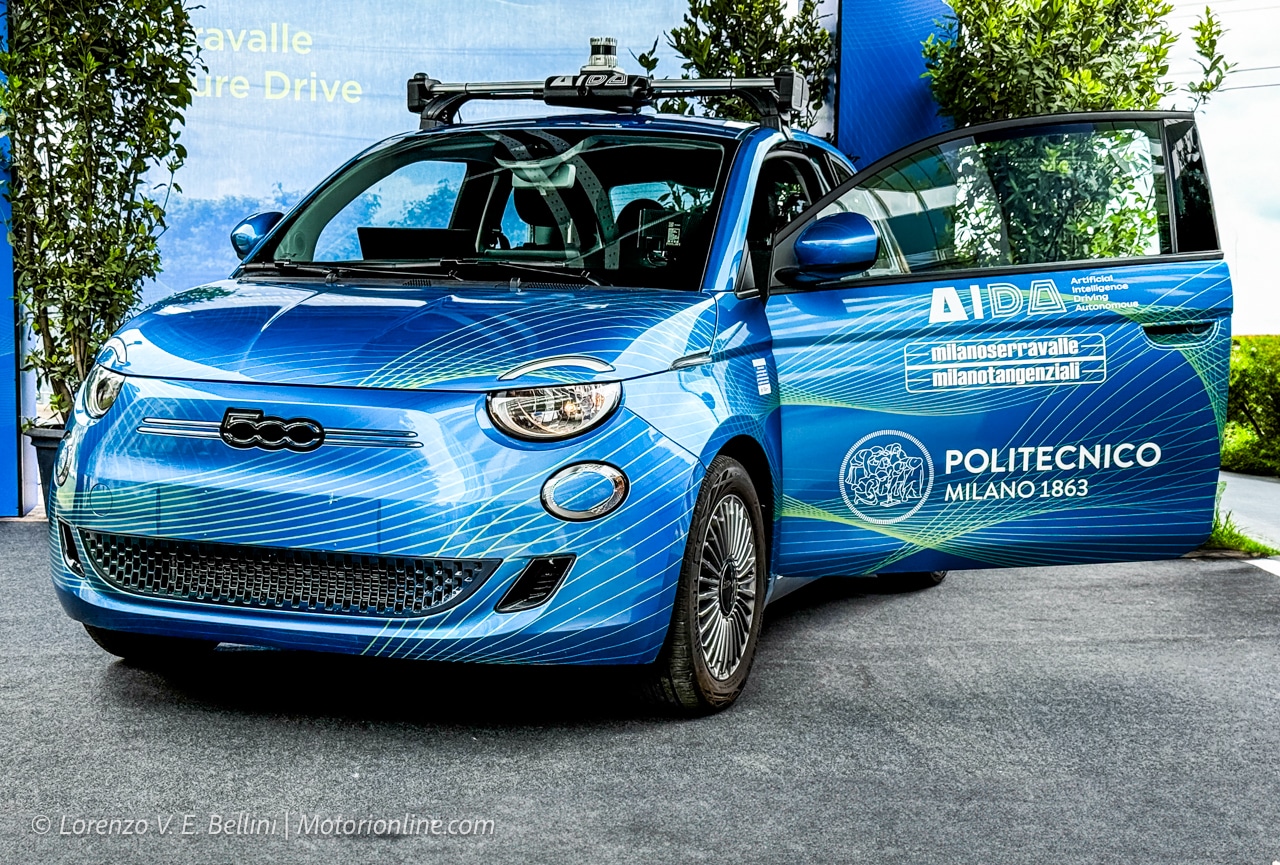 La sperimentazione, di cui ci è stata mostrata una dimostrazione dal vivo, si sta sviluppando sul tratto autostradale che dalla stazione di Famagosta della Metropolitana Linea 2 Verde di Milano arriva fino all’ingresso dell’A7 (la Serravalle, per l’appunto) in città. Tutto ciò è possibile grazie ad una Fiat 500e debitamente modificata con degli attuatori sul volante (foto in alto) e dei sensori montati direttamente sul tetto della vettura (foto in basso). Questo sistema utilizza la tecnologia LiDAR (la stessa usata per mappare i circuiti nei videogiochi di Formula 1, per intenderci) per avere una mappatura precisa al centimetro e in tempo reale non solo della strada e di ogni tipo di segnaletica, ma anche del traffico che ci circonda, consentendo di viaggiare in piena sicurezza, anche ad alte velocità (nella dimostrazione sono stati rispettati sempre i limiti imposti dal codice, ovviamente).