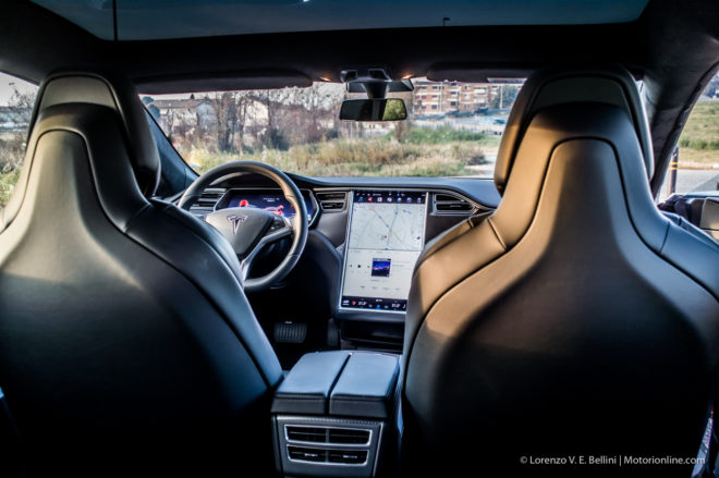 Se l’esterno è elegante e di classe, l’interno è a dir poco sontuoso. Assolutamente al livello del segmento delle berline di lusso, con in aggiunta un carico di tecnologia talmente alto che non sorprende che il marchio californiano sia considerata una sorta di “Apple del mondo automotive”. Potendosi dilungare sui suoi 4.978 mm di lunghezza totale, la Model S è una delle berline più spaziose che ci sia mai capitato di provare. Persino sulla fila posteriore, dove troviamo altri tre posti “veri”, non con una “vittima” sacrificale al centro di due persone comode. Qui tutti si sentono in un salotto, grazie anche ai materiali di prima qualità che compongono le sellerie. Pelle e Alcantara dominano incontrastate, con giusto qualche aggiunta sapiente di pannelli in fibra di carbonio per dare un pizzico di “verve” sportiva in più, assolutamente giustificata dalla spinta del motore elettrico.