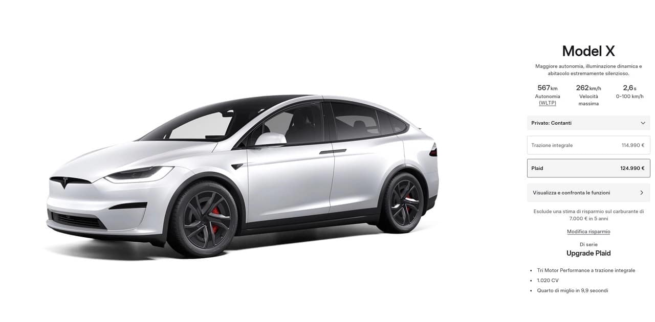I prezzi delle nuove Tesla confermano la fascia premium del marchio: la Model S AWD parte da 109.990 euro, mentre la S Plaid è proposta a 119.990 euro. Per la Model X, la versione AWD costa 114.990 euro, mentre la X Plaid arriva a 124.990 euro, consolidando Tesla come punto di riferimento nel segmento delle auto elettriche ad alte prestazioni.