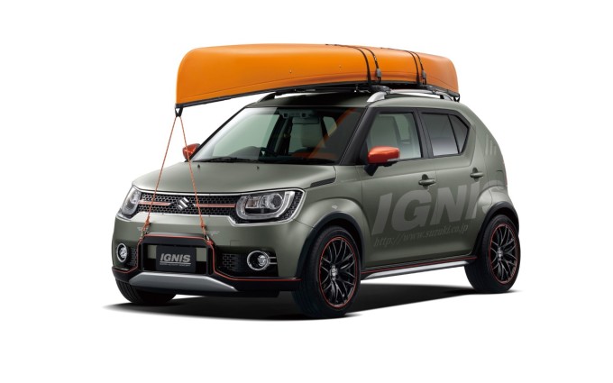Al Tokyo Auto Salon 2016, importante kermesse nipponica con grande spazio al tuning, Suzuki presenterà tre show car che daranno colore e personalità allo stand del marchio giapponese. Le tre speciali vetture di Suzuki sono la Ignis Water Activity, la Hustler Rough Road e la Alto Works GP.