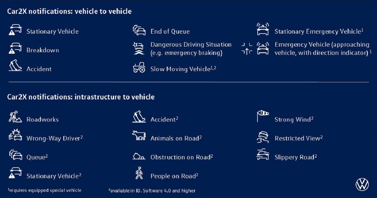 Car2X funge anche da sensore virtuale, integrandosi con i sistemi di assistenza alla guida come Travel Assist con ACC, che può regolare la velocità automaticamente, migliorando comfort, efficienza e sicurezza, anche in presenza di code o ostacoli non ancora visibili. Per i cambi di corsia assistiti in autostrada, Car2X consente un controllo più preciso dell’accelerazione. In futuro, anche biciclette, motociclette, camion e autobus potrebbero essere connessi. Volkswagen partecipa alla Coalition for Cyclist Safety, fondata nel 2023, per integrare i ciclisti nell’ecosistema tecnologico e aumentare la loro sicurezza.