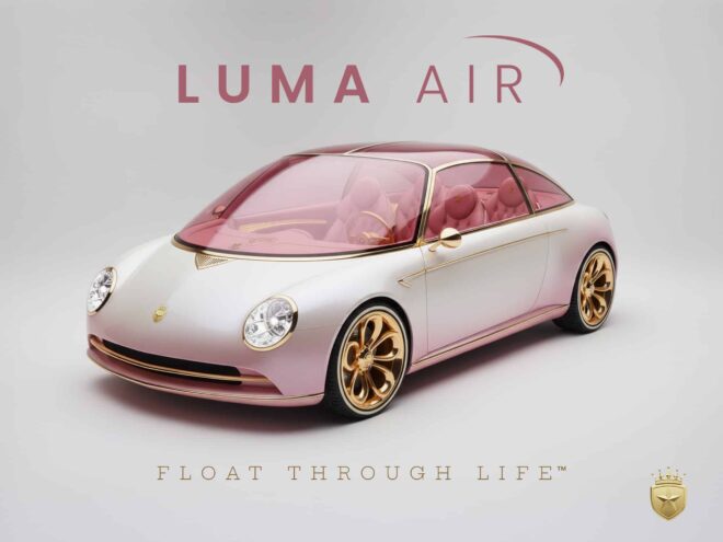 La Luma Air, che vediamo qui sopra, è la proposta che reinterpreta la famosa bolla di Glinda trasformandola in una vera city car elettrica. Questo concept presenta forme tondeggianti, superfici morbide e una palette pastello che richiama l’estetica luminosa e fiabesca della strega buona. La carrozzeria è avvolta da vetri rosa e fari diamantati, mentre dettagli in oro sottolineano il look elegante e radioso.