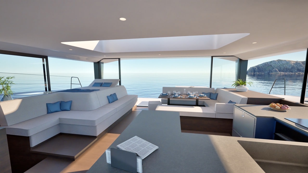 L’ambiente interno è l’aspetto più innovativo, grazie al concept 360 Horizon Cabin. Propone un tetto flottante con telaio in vetro invisibile ed un layout aperto del pozzetto/ponte, che offre una vista a 360° sull’orizzonte libera da ostacoli. Questo senso di apertura e connessione con l’ambiente si estende alle cabine inferiori, attraverso una maggiore visibilità e una spaziosità che aumenta il comfort, mentre il ponte posteriore è ad ala flottante, con un migliore accesso alle cabine.